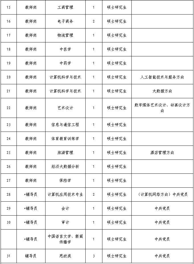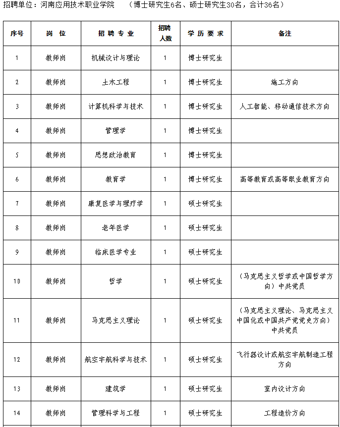 ?根據中共河南省委組織部、河南省人力資源和社會保障廳《關于印發<河南省事業單位公開招聘工作規程>的通知》(豫人社〔2015〕55號)規定,我院擬面向社會公開招聘教師36名,其中博士研究生6名、碩士研究生30名。方案如下: