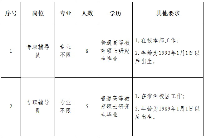 ?根據《河南省事業單位公開招聘工作規程》(豫人社〔2015〕55號)和《關于進一步加強和改進事業單位公開招聘工作的意見》(豫人社事〔2016〕4號)文件規定,學校面向社會公開招聘員額制專職輔導員(碩士研究生)13名。結合學校實際,特制定本方案。
