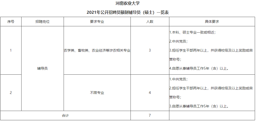 7.其他要求見附件《河南農(nóng)業(yè)大學2021年公開招聘員額制輔導員(碩士)一覽表》。