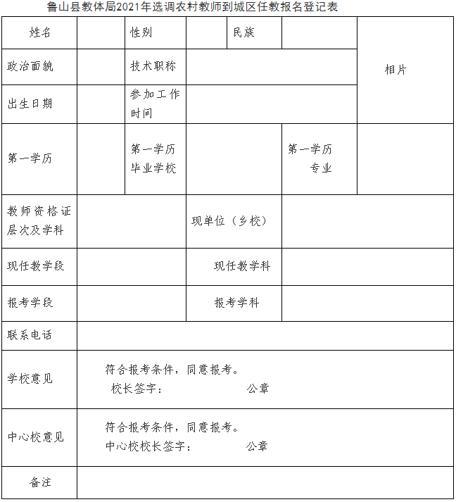 填寫《魯山縣2021年公開選調教師報名登記表》(見附件),學校、鄉鎮中心校進行初步審核,符合報考條件的,在登記表上簽署“符合報考條件,同意報考”字樣,校長簽名并加蓋公章。