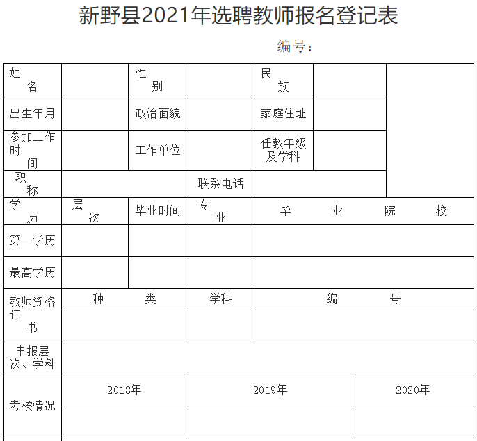 2.報名。符合條件人員須持本人第一學歷和最高學歷畢業證、身份證、教師資格證原件及復印件(A4)、中心學校出具的證明(XX單位、XX學科、2018年以來年度考核結果)。報考高中、初中、小學教師崗位人員只能選擇一個學科。報名時,每人需交近期一寸同底免冠彩照3張,填寫《新野縣2021年選聘教師報名登記表》(附件2)(可網上下載)。報名地點:報考高中教師在明德雙語學校,報考初中、小學教師在漢興學校。報名時間:2021年8月13日至2021年8月15日。