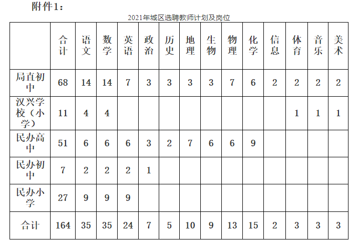 公開選聘教師164名。其中,小學教師38名,初中教師75名,高中教師51名。(具體選聘計劃及崗位見附表1)。