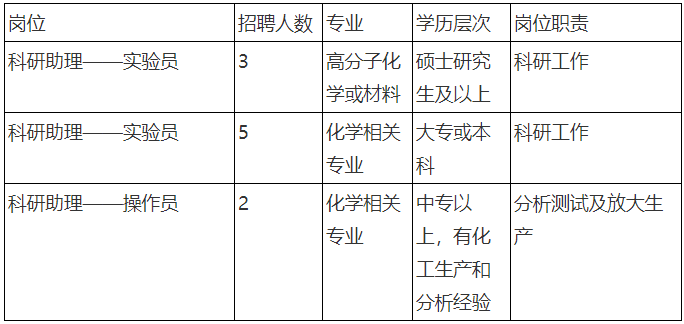 1、實驗員崗位需化學相關專科及本科學歷,或高分子化學或材料相關專業碩士研究生及以上學歷;