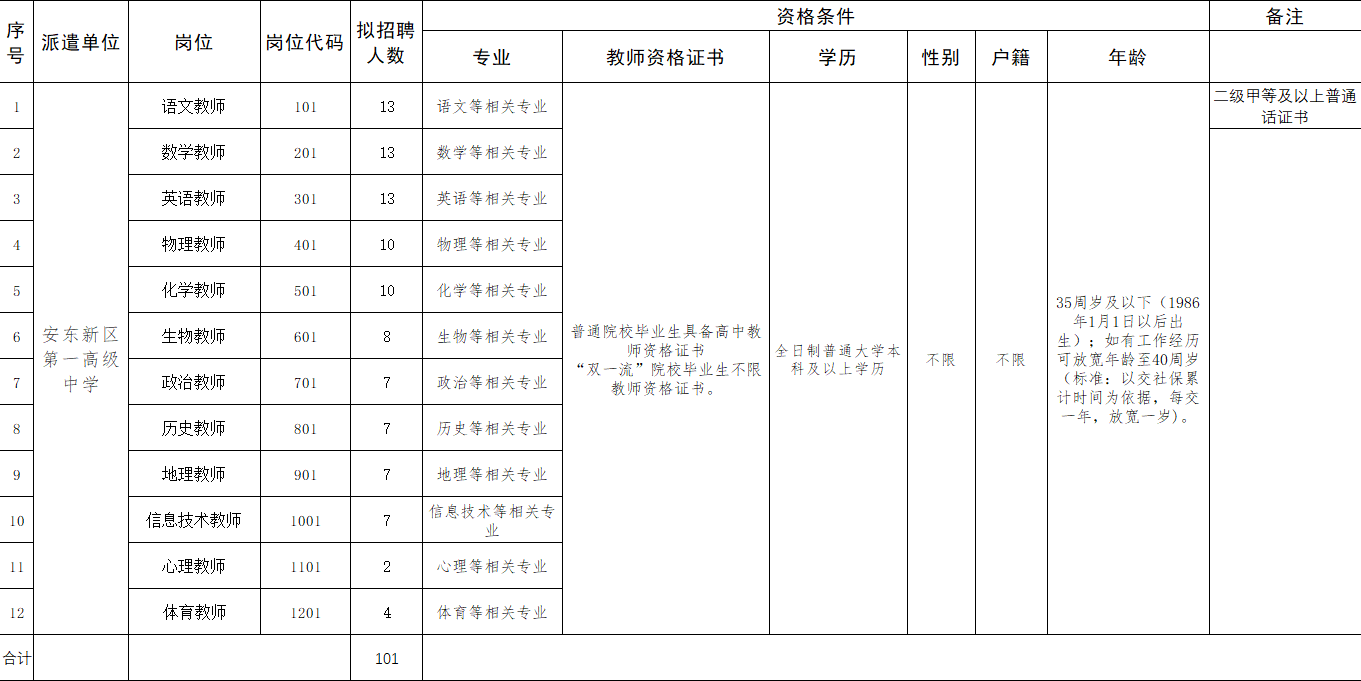 (一)招聘數量: 公開招聘代課教師101名。