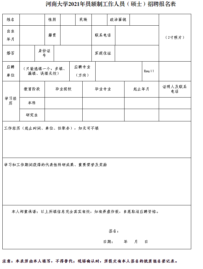 2.河南大學2021年員額制工作人員(碩士)招聘報名表