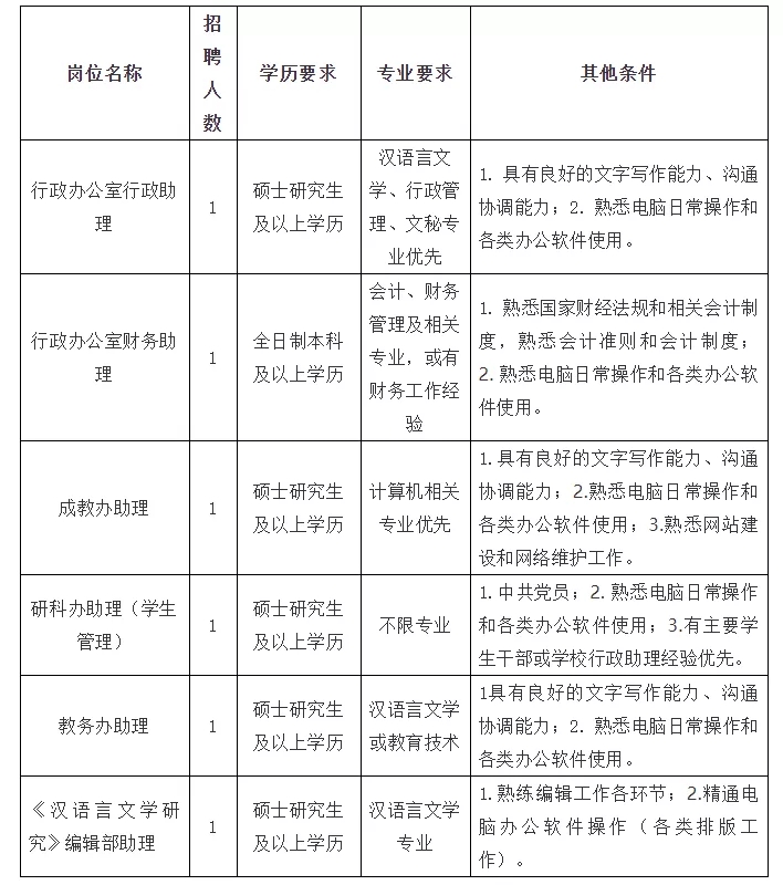6.《漢語言文學研究》編輯部助理:協助完成《漢語言文學研究》編輯部日常工作。