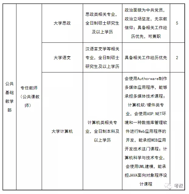 聘請具有副高以上職稱或雙師資格的教師擔任骨干教師、專業(yè)帶頭人等。要求具有高校管理工作經歷,碩士研究生及以上學歷。