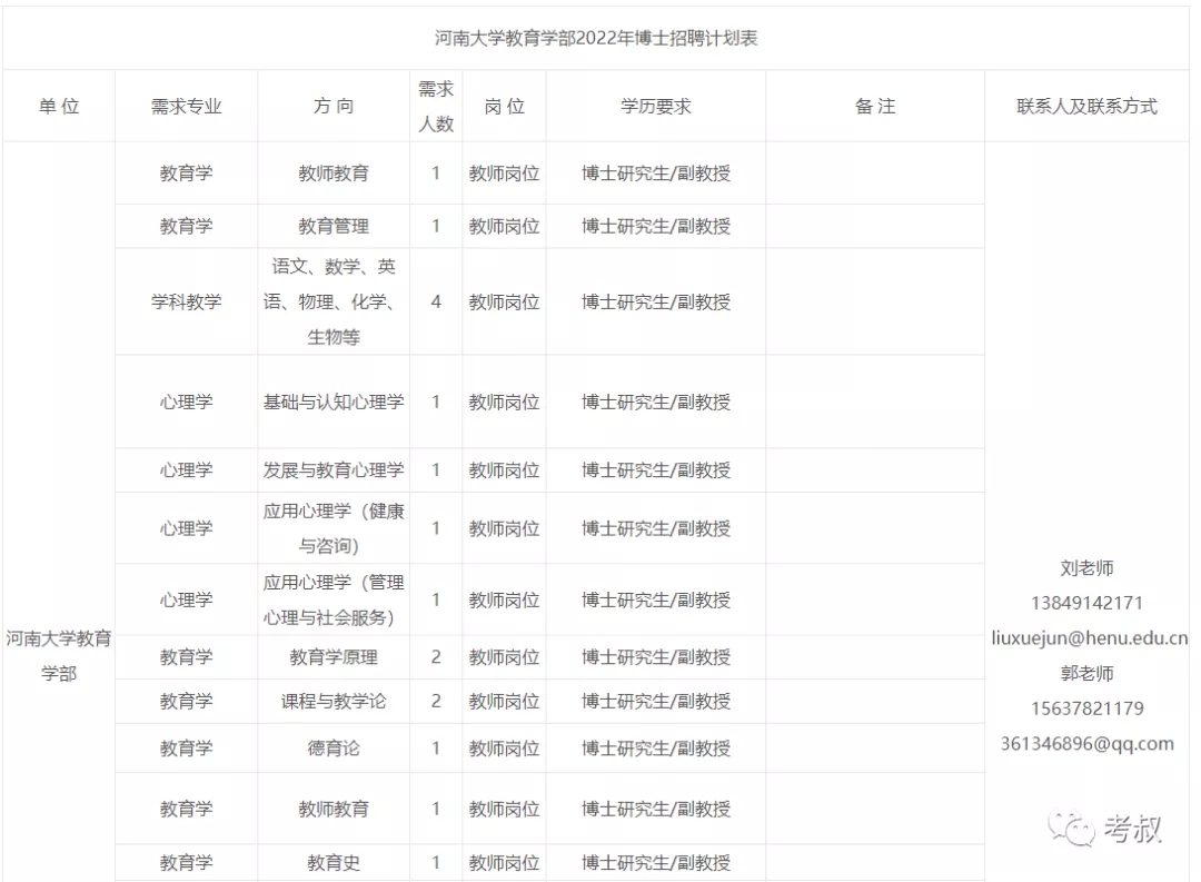 詳見附件《河南大學教育學部2022年博士招聘計劃表》。
