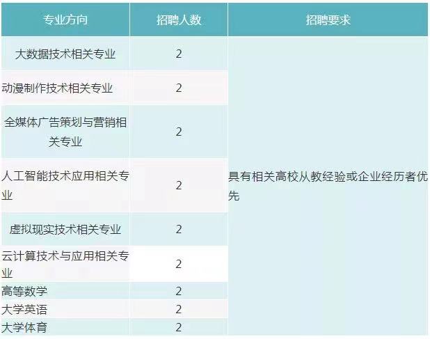具有碩士學(xué)位,年齡不超過35周歲,具有良好的職業(yè)道德、較強(qiáng)的教學(xué)、科研能力和合作精神,身體健康。本科與碩士研究生階段所學(xué)專業(yè)相同或相近,英語通過國家四級。應(yīng)聘英語教師崗位的人員應(yīng)通過英語專業(yè)八級考試。任職要求1.具有相關(guān)高校從教經(jīng)驗(yàn)或企業(yè)經(jīng)歷者優(yōu)先;2.具備從事科研、教學(xué)工作的能力和素質(zhì);3.本碩專業(yè)一致或相近;4.能承擔(dān)相關(guān)專業(yè)課程的教學(xué)任務(wù)。