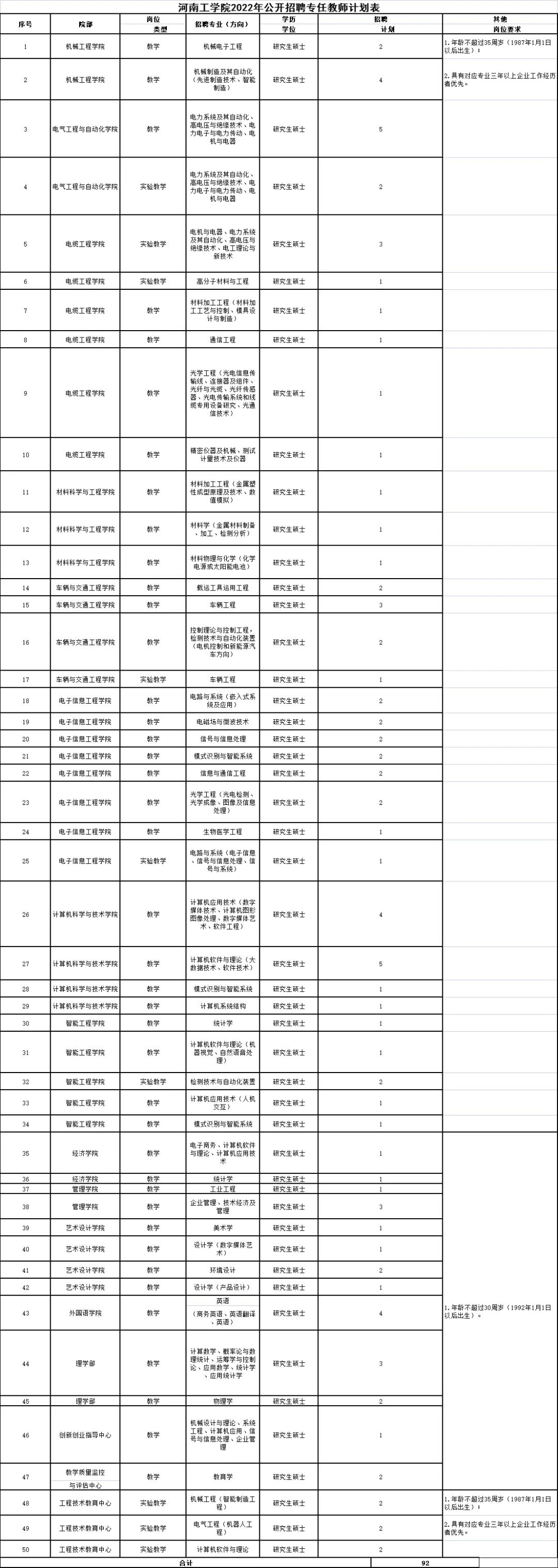 招聘專任教師76名、專任教師(實驗教學)16名,詳見附件《河南工學院2022年公開招聘專任教師計劃表》。