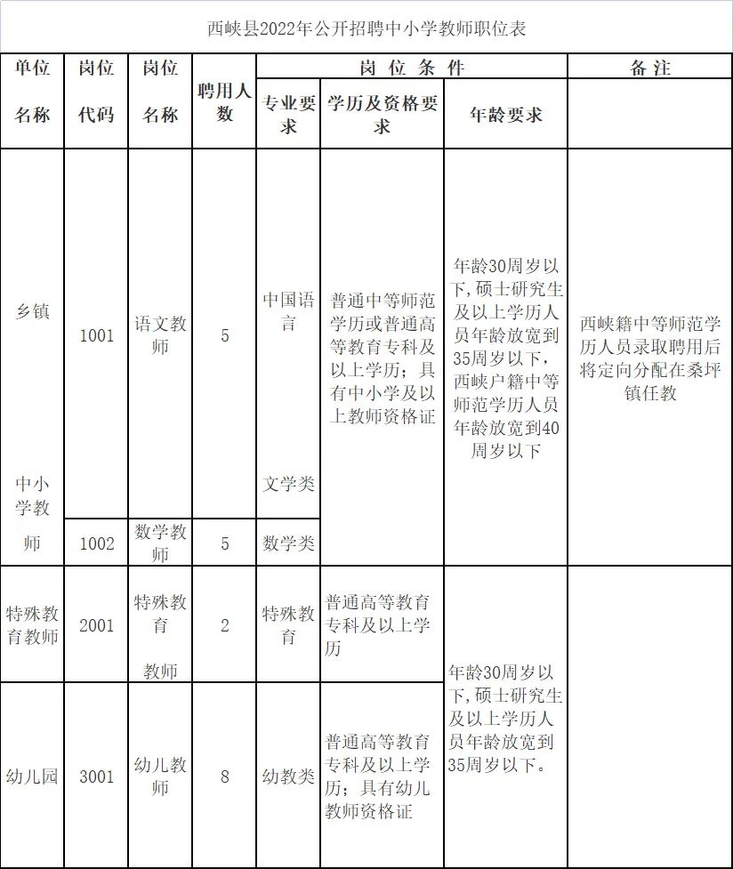 本次共招聘中小學教師20名。具體招聘職位及名額見《西峽縣2022年公開招聘中小學教師職位表》。(附后)