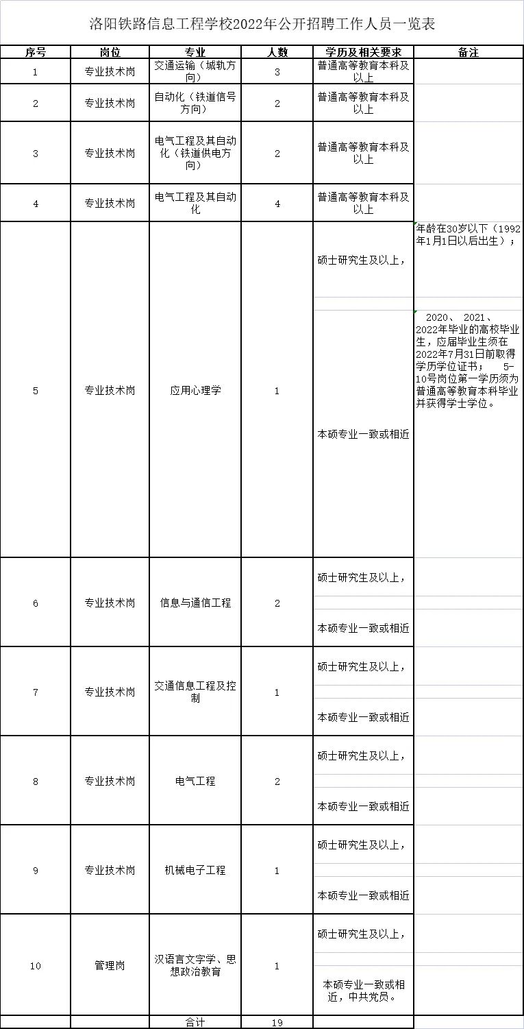 本次面向社會公開招聘工作人員19名,具體專業、人數等詳見《洛陽鐵路信息工程學校2022年公開招聘工作人員一覽表》(附件1)。