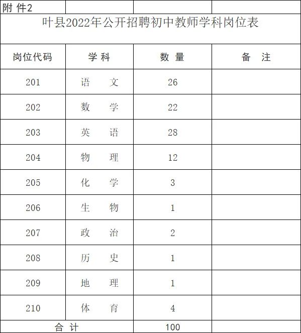 2.葉縣2022年公開招聘初中教師學科崗位表