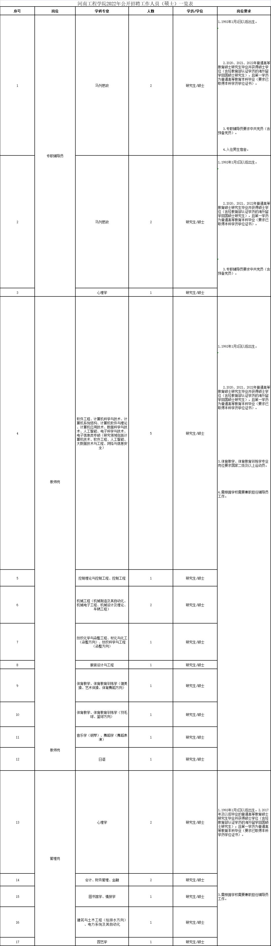 附件:河南工程學院2022年公開招聘工作人員(碩士)一覽表