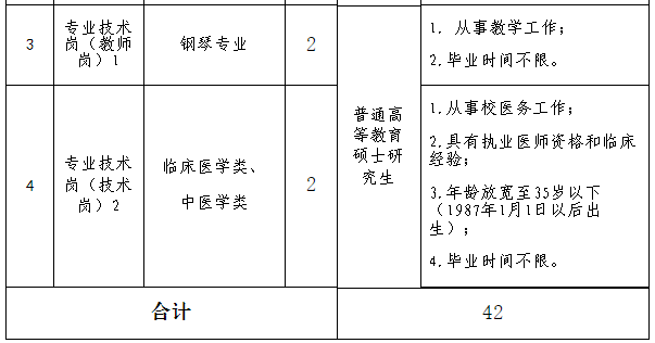 6.2020、2021、2022年畢業的普通高等教育碩士研究生及以上學歷(應屆畢業生須在2022年7月31日前取得學歷學位證書),且第一學歷為普通高等教育本科畢業并取得學士學位。應聘金融及管理、鋼琴、臨床醫學類和中醫學對應崗位者,畢業時間不限;