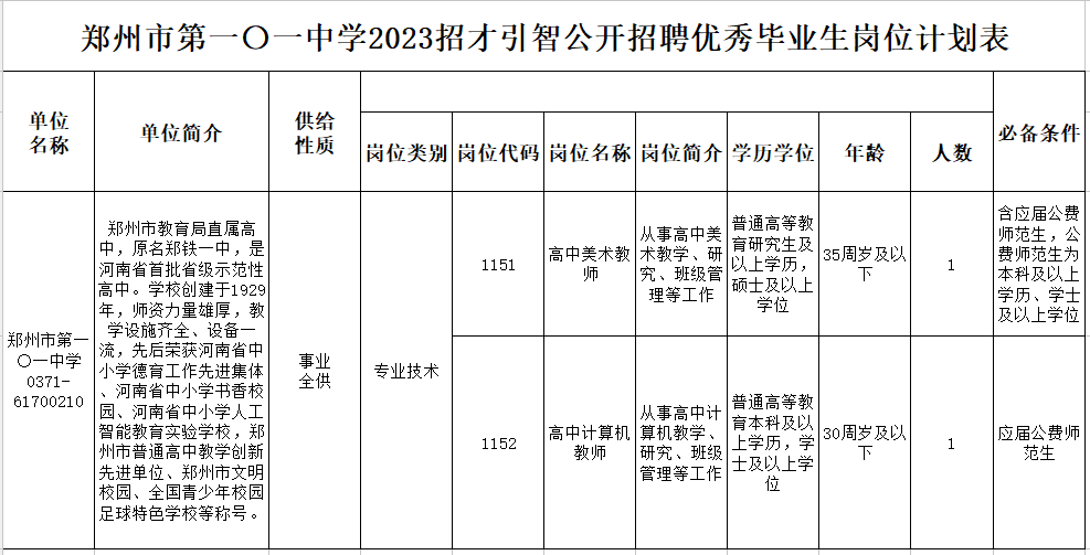 鄭州市第一〇一中學2023招才引智公開招聘優秀畢業生公告