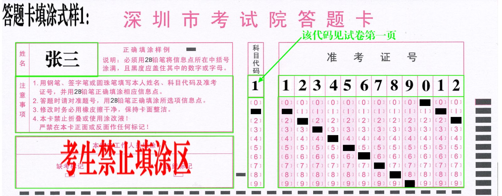 考生須使用黑色簽字筆將姓名、準考證號認真填寫在相應位置,使用2B鉛筆填涂對應信息點,每個書寫框只能填寫一個阿拉伯數字(具體填寫、填涂見下圖)。
